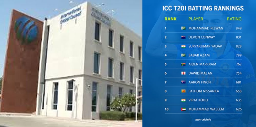نیوزی لینڈ کے ڈیون کانوے رینکنگ میں دوسرے پر آ گئے ہیں جبکہ بھارت کے سوریا کمار یادیو تیسرے پر چلے گئے ہیں اور ویرات کوہلی 15 ویں سے 9 ویں نمبر پر آ گئے ہیں۔