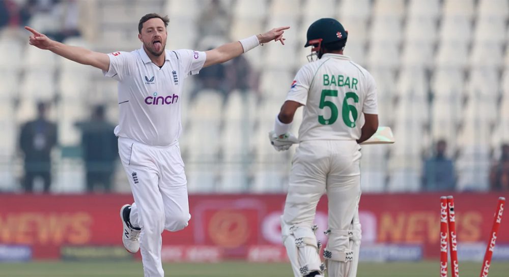 دوسرے روز پہلے سیشن میں کپتان بابر اعظم انگلش بولر اولی رابنسن کی گیند پر 75 رنز پر بولڈ ہوگئے جس کے بعد سعود شکیل جیک لیچ کی گیند پر جیمس اینڈریسن کو کیچ دے بیٹھے اور 63 رنز کے ساتھ پویلین لوٹ گئے ،محمد رضوان کو بھی جیک لیچ نے بولڈ کردیا اس کے بعد جو روٹ آغا سلمان اور محمد علی جبکہ جیک لیچ محمد نواز کی وکٹ لینے میں کامیاب رہے۔