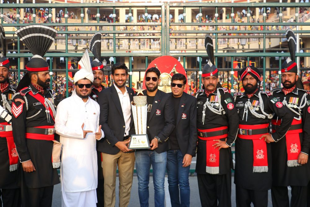 قلندرز کے فاسٹ باؤلر حارث رؤف ٹرافی اٹھائے واہگہ بارڈرپہنچے، نوجوان بیٹر طاہر بیگ بھی حارث رؤف کے ہمراہ تھے۔ لاہورقلندرز کے عاقب جاوید، عاطف رانا اور ثمین رانا بھی ان کے ساتھ تھے۔