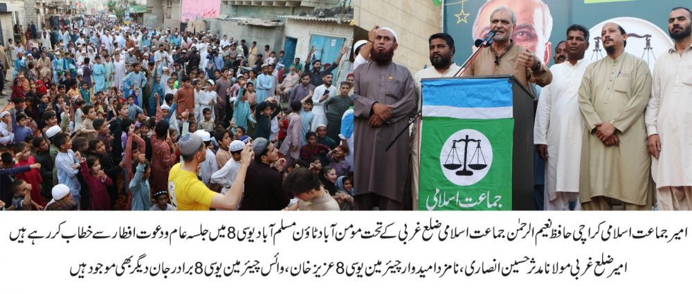 ان خیالات کا اظہار انہوں نے جماعت اسلامی ضلع غربی کے تحت مومن آباد ٹاؤن مسلم آباد یوسی 8میں جلسہ عام و دعوت افطار سے خطاب کرتے ہوئے کیا۔ تقریب سے ڈپٹی سکریٹری کراچی عبد الرزاق خان،امیرجماعت اسلامی ضلع غربی مولانا مدثر حسین انصاری، سیکرٹری ضلع غربی عبد الحنان،نائب امراء حمید اللہ خان ایڈوکیٹ،خالد زمان،نامزد امیدوارچیئرمین عزیز خان،وائس چیئرمین برادر جان ودیگر نے بھی خطاب کیا۔
