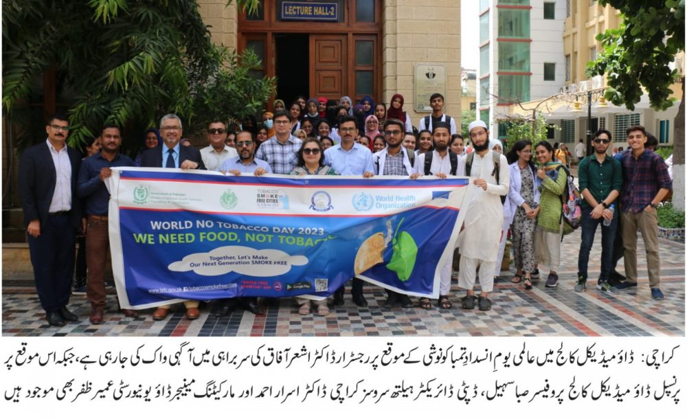 ڈاؤ میڈیکل کالج کی پرنسپل پروفیسر صبا سہیل نے کہا کہ سگریٹ نوشی ہماری صحت اور ماحول کے لیے نقصان دہ ہے اس کے استعمال سے کینسر، امراض قلب، فالج، پھیپھڑوں کے امراض، شوگر، تنفس میں رکاوٹ کا پیچیدہ مرض (سی او پی ڈی) بھی ہو سکتا ہے۔ ڈپٹی ڈائریکٹر ہیلتھ سروسز کراچی ڈاکٹر اسرار احمد نے کہا کہ سگریٹ نوشی سے مہلک مرض ٹی بی ہونے کے خطرات بہت زیادہ بڑھ جاتے ہیں، امراض چشم کے علاوہ مدافعتی نظام کے مسائل، جوڑوں کی سوجن مرض رہیومٹائیڈ آرتھرائٹس بھی ہو سکتا ہے۔ واک کے شرکاء نے آراگ آڈیٹوریم سے ایڈمنسٹریشن بلاک تک واک کی۔ مقررین نے کہا کہ سگریٹ نوشی سے ہونے والے نقصانات سے آگاہی فراہم کرنے کےلئے اس دن کو منایا جاتا ہے۔ عالمی ادارہ صحت (ڈبلیو ایچ او) کی جاری کردہ رپورٹ کے مطابق دنیا کی 22.3 فیصد آبادی تمباکو کا استعمال کرتی ہے جبکہ دنیا میں مردوں کی کل آبادی میں سے 39 فیصد اور خواتین کی کل آبادی میں سے نو فیصد خواتین تمباکو کا استعمال کرتی ہیں۔