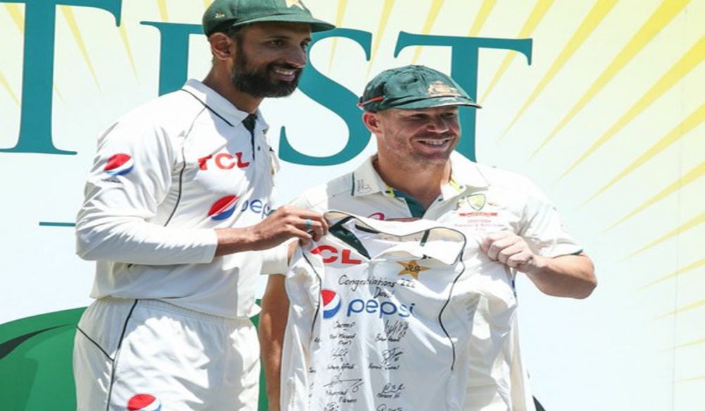شان مسعود نے بابر اعظم کی شرٹ تحفے میں ڈیوڈ وارنر کو پیش کی جس پر پوری ٹیم کے دستخط تھے، کپتان شان مسعود نے ڈیوڈ وارنر کے لیے نیک خواہشات کا بھی اظہار کیا۔