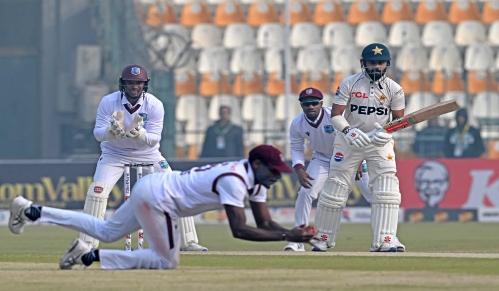 اس سے قبل پہلی اننگز میں ویسٹ انڈیز کی پوری ٹیم 137 رنز پر پویلین لوٹ گئی تھی۔ ساجد خان اور نعمان علی نے مہمان ٹیم کی اننگز کو صرف 25 اعشاریہ 2 اوورز میں ہی سمیٹ دیا تھا۔