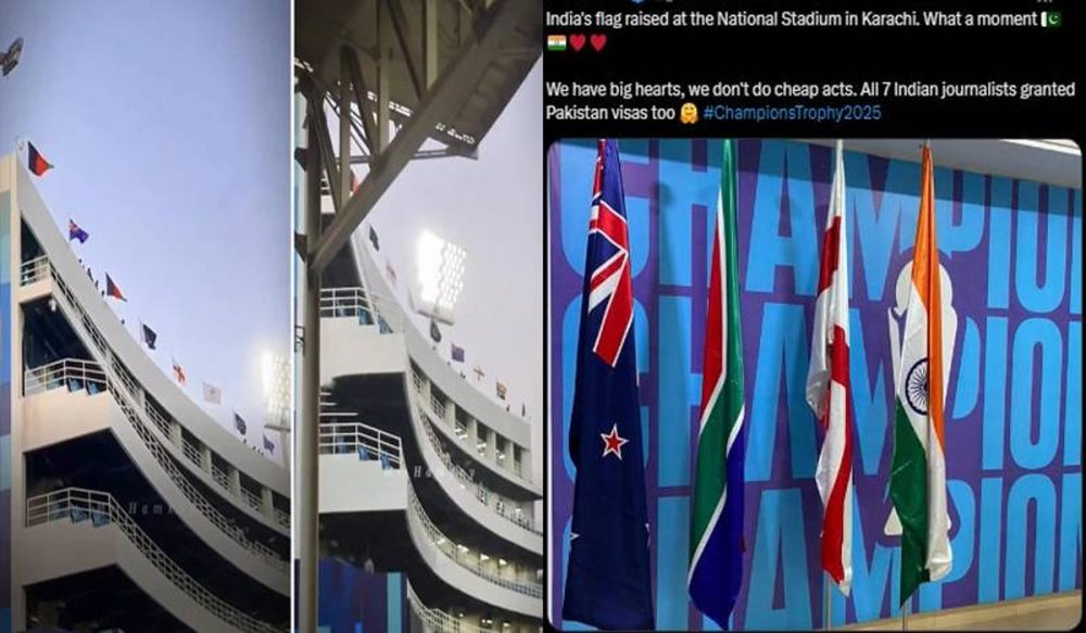 سوشل میڈیا پلیٹ فارم پر ایک پاکستانی صحافی نے نیشنل ا سٹیڈیم کے اندر بھارتی ٹیم کے جھنڈے کی تصویر شیئر کرتے ہوئے کیپشن میں لکھا کہ کراچی کے نیشنل اسٹیڈیم میں بھارت کا جھنڈا لہرا دیا گیا ہے، ہمارے دل بڑے ہیں، آپ کی طرح گھٹیا نہیں۔