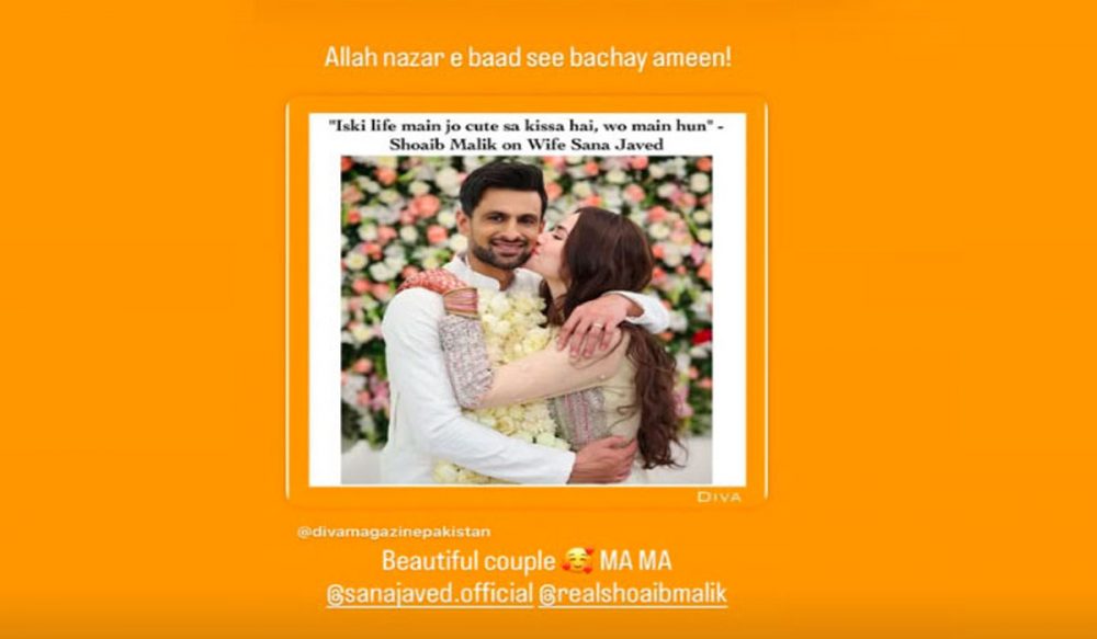اداکارہ ثنا جاوید نے بھی اپنی انسٹا اسٹوری میں شعیب کے بیان کو شیئر کرتے ہوئے دعا کی کہ جوڑے کو نظر بد سے محفوظ رکھا جائے۔ اسٹوری میں انہوں نے کیپشن کے طور پر “آمین ثم آمین” لکھ کر خوشی کا اظہار کیا۔