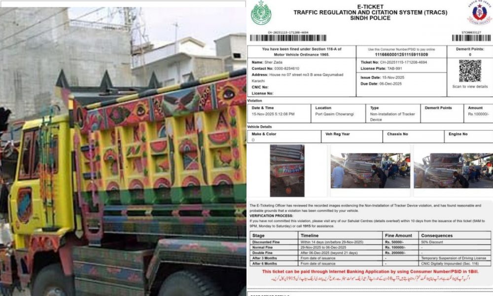 کراچی میں ٹریفک پولیس نے ایک ڈمپر پر ٹریکر نصب نہ کرنے پر ایک لاکھ روپے جرمانہ عائد کر دیا۔ یہ کارروائی پورٹ قاسم چورنگی کے قریب کی گئی، جہاں ٹریفک قوانین کے تحت ڈمپروں میں ٹریکر نصب کرنا لازمی قرار دیا گیا ہے۔