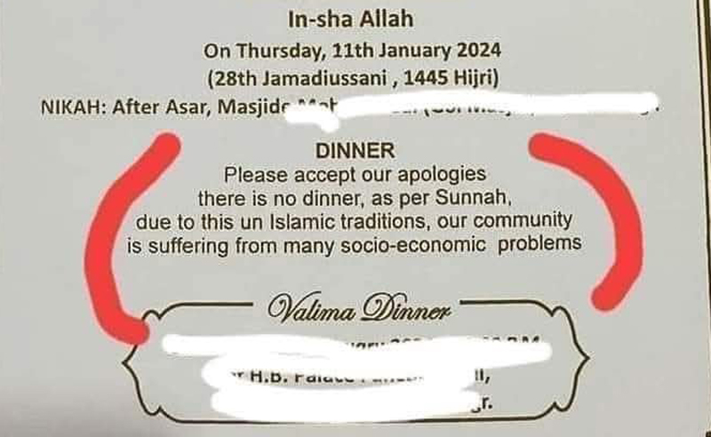 کارڈ وائرل ہونے کی خاص وجہ اس پر کھانے سے متعلق لکھا نوٹ ہے جس میں کہا گیا ہے کہ ’معذرت قبول کیجیئے، سنتِ نبوی کی پیروی کرتے ہوئے کھانے کا اہتمام نہ کرنے کا فیصلہ کیا گیا ہے۔