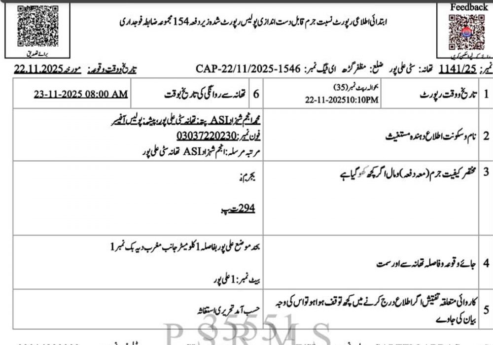 ایف آئی آرکے مطابق مدعی پولیس افسرنے ارتکاب جرم 294 ت پ کے تحت مقدمہ درج کرنے کی درخواست کی ۔
