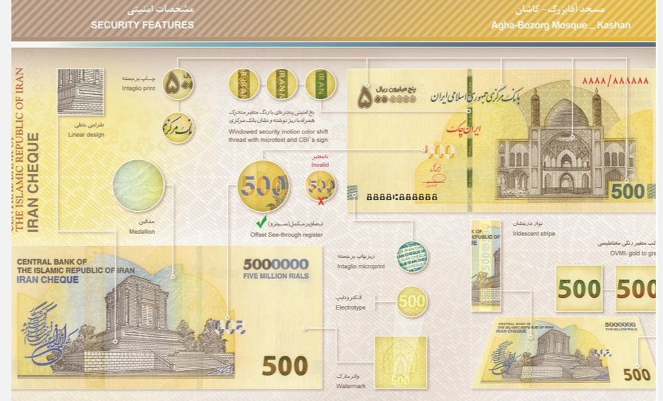 ایران کے مرکزی بینک نے ملک کے سب سے بڑے بینک نوٹ، 5 ملین ریال (تقریباً 3اعشاریہ 10ڈالر) کا ایرانی چیک تقسیم کرنا شروع کر دیا ہے، کیونکہ قومی کرنسی مسلسل کمزور ہوتی جا رہی ہے اور نقد لین دین کے لیے پہلے سے زیادہ مالیت کی ضرورت ہے۔یہ نوٹ پاکستانی کرنسی میں 867 اعشاریہ 50 روپےبنیں گے۔