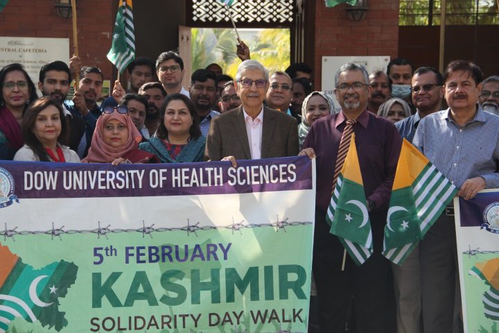 ڈاو یونیورسٹی میں یوم یکجہتی کشمیرکے موقع پرواک اورریلی نکالی گئی February 6, 2023 ریلی میں وائس چانسلر ڈاکٹر سارہ قاضی، ڈاکٹرز،اساتذہ اور بڑی تعداد میں طلبہ و طالبات نے شرکت کی