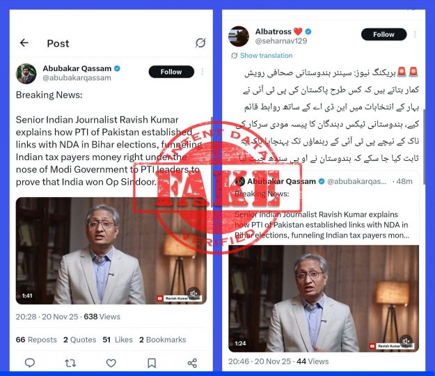 فیکٹ چیک:کیامعروف بھارتی صحافی نے پی ٹی آئی کی بھارت سے فنڈنگ کا دعویٰ کیا؟ November 21, 2025 رویش کمار تحریک انصاف اور بہارمیں حکمران اتحاد کے درمیان مبینہ روابط پر گفتگو کرتے سنائی دیتے ہیں