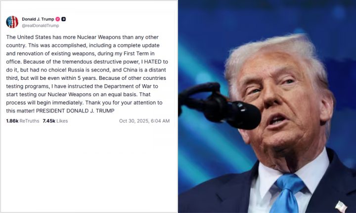 ٹرمپ نے امریکی فوج کو جوہری ہتھیاروں کی فوری ٹیسٹنگ کا حکم دے دیا October 30, 2025 امریکا کے پاس سب سے زیادہ ہتھیار ہیں، روس دوسرے نمبر پر ہے اور چین پانچ سال میں امریکا کے…