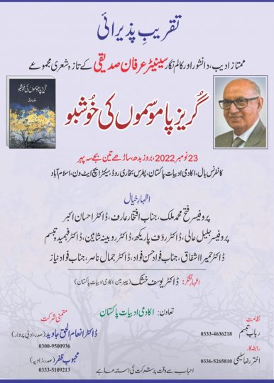عرفان صدیقی کے شعری مجموعے “گریزپا موسموں کی خوشبو” کی تقریب رونمائی November 22, 2022 کل بروز بدھ پہر ساڑھے تین بجے اکادمی ادبیات اسلام آباد میں ہوگی۔پروفیسر فتح محمد ملک ،افتخار عارف ،ڈاکٹر احسان…