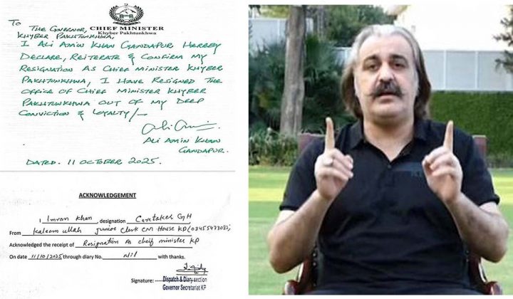 گنڈاپور کا ہاتھ سے تحریری استعفیٰ گورنر ہاوس پہنچا دیا گیا October 11, 2025 کیئر ٹیکر نے استعفیٰ وصول کر کے رسید بھی جاری کر دی، جس میں وقت دوپہر 2:30 بجے درج ہے۔