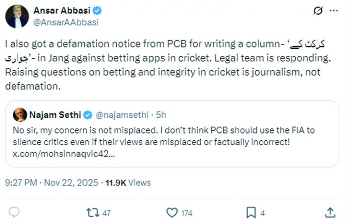 ’ کرکٹ کے جواری‘‘ کالم پر انصارعباسی کو نوٹس۔سیٹھی اور نقوی میں لفظی جنگ November 23, 2025 ناقدین کو خاموش کرنے کے لیے ایف آئی اے کا استعمال نہیں کرنا چاہیے۔ سابق چیئرمین پی سی بی